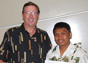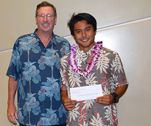 Lahainaluna High School Foundation's Rob Shelton presents Blaine Casil with Kaanapali Land Management Corp.'s scholarship check.